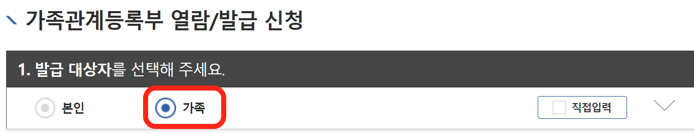 ⚠️ 기본증명서 발급 시, 발급대상자를 [가족]으로 선택해야 , [자녀]의 기본증명서를 발급할 수 있습니다.