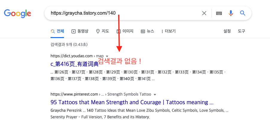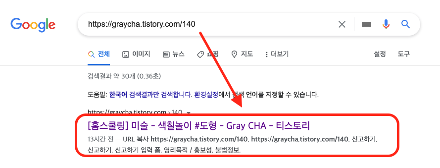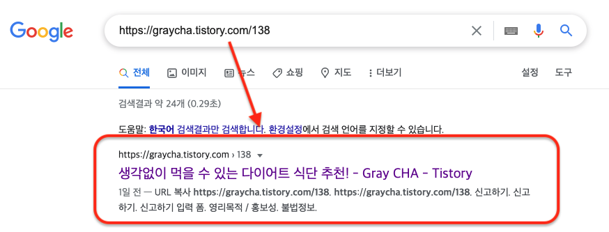 정상적으로 색인 생성이 되었다면, 포스팅한 주소를 검색했을 때 검색 결과로 표시되야합니다.