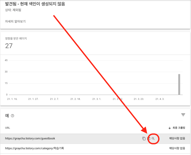 [ ㅁ제외됨 ] 상태의 상세내역 중 '색인이 생성되지 않음' 항목을 클릭하여, 세부내역으로 진입하여