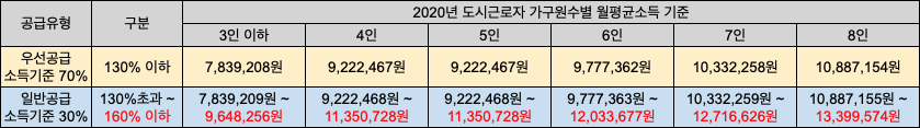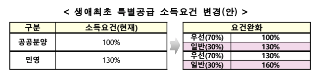 - 일반공급의 소득기준이 130%(맞 160%)로 상향되었습니다.