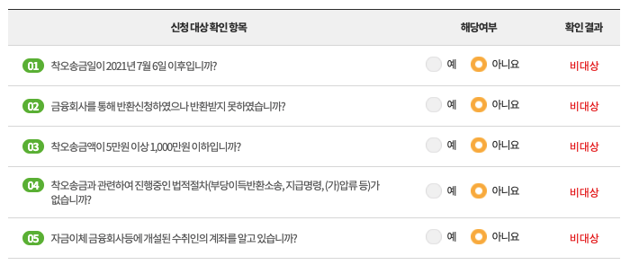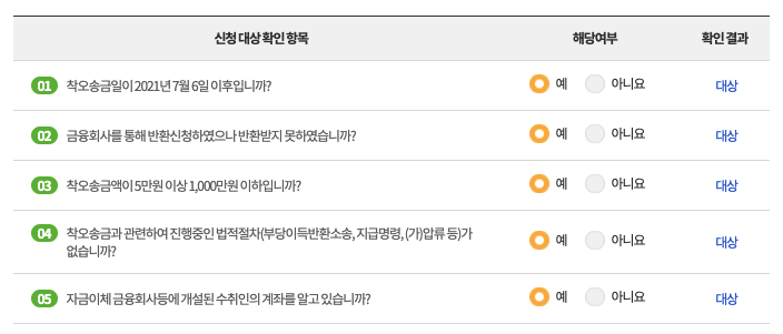 - 2021.07.06 이후 발생한 착오송금에 대하여 송금일로부터 1년 이내만 신청 가능합니다.