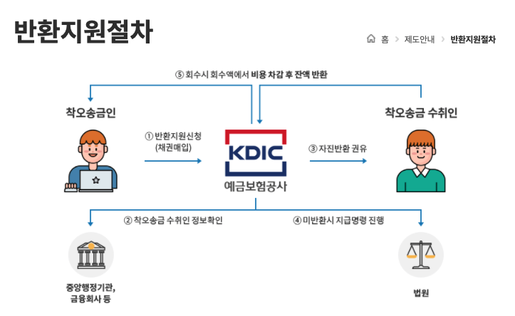착오송금 수취인은 예금보험 공사로 반환금을 입금하고, 예금보험공사는 회수 시 발생한 '비용 차감' 후, 송금인에게 전달합니다.