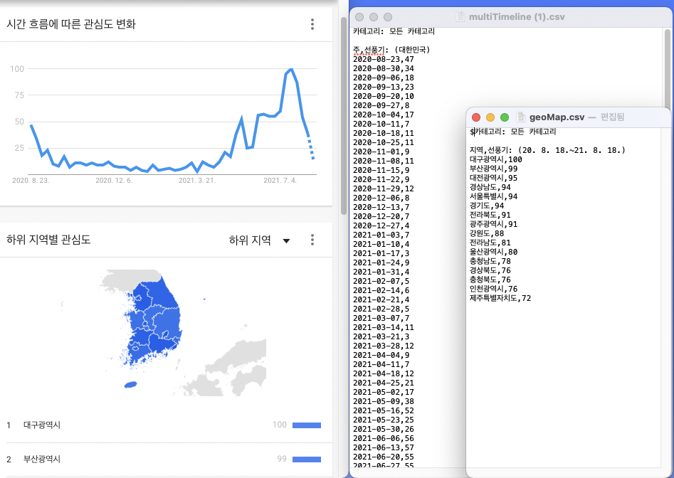 아래는 구글 트랜드에서 검색한 시간 흐름별 정보와 지역별 관심도 정보를. csv 파일 데이터로 다운로드한 데이터다.
