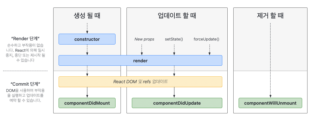 모든 컴포넌트는 생명주기 메서드를 가지며, 크게 마운트(mount) / 업데이트(update) / 언마운트(unmount) 의 개념으로 구분됩니다.