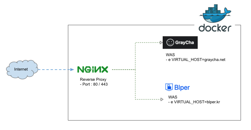 Docker를 활용한 서버 구성도며, 하나의 서버에서 Docker container 확장을 통한 WAS 운영이 목표였다. Docker jwilder/nginx-proxy 를 통한 Reverse Proxy 환경을 구현할 수 있었고, 아래와 같은 서버 구성으로 서비스를 운영 중이다.