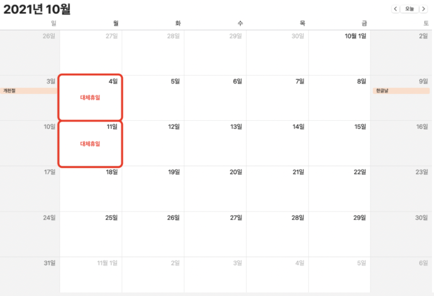대체공휴일 적용 ➠2021.10.11(월)