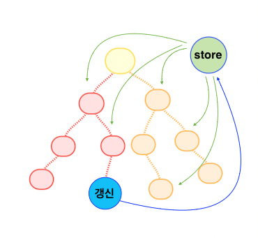 다음, 리덕스를 사용했을 경우 상태 관리 과정을 살펴보자. 지역 컴포넌트에서 상태가 변경되면, 스토어라는 곳에서 전체 컴포넌트의 상태를 관리해주고 있어서, 여러 컴포넌트를 거치지 않고 쉽게 상태값을 전달하거나 업데이트할 수 있다.