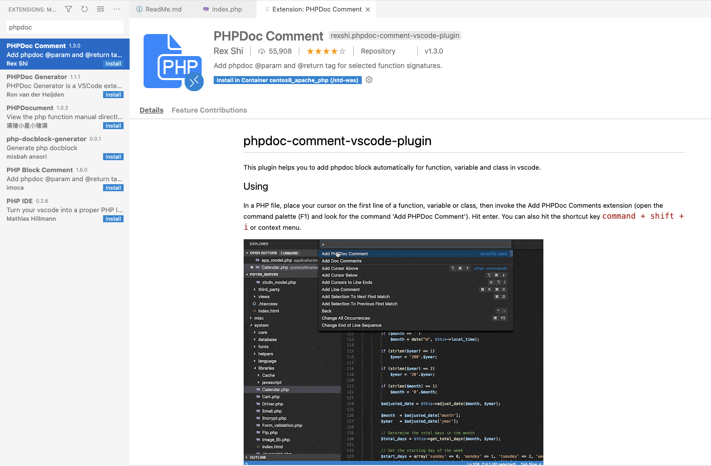 PHPDoc Comment 는 정형화된 주석을 자동으로 생성하여, 프로그램의 가독성을 높이고 유지관리를 효율적으로 할 수 있게 도와주는 Plugin 입니다. 클래스, 함수, 변수에 대해 PHPDoc 블록을 자동으로 추가 해줍니다.
